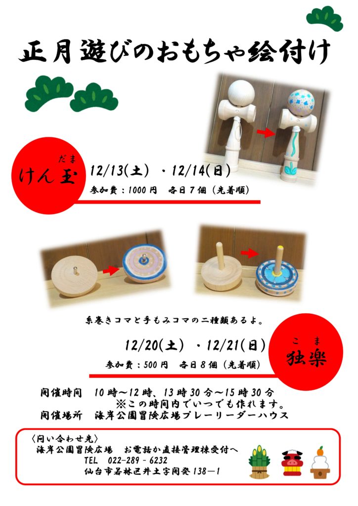 今年もやります!オリジナルけん玉!独楽! 2025/11/30(日)2026/01/06(火)12月2週にわたり、自分だけのオリジナルけん玉と独楽の絵付けをやります!オリジナルけん玉、独楽を作ってお正月に遊ぼう!!数に限りがあります。お早めに!!