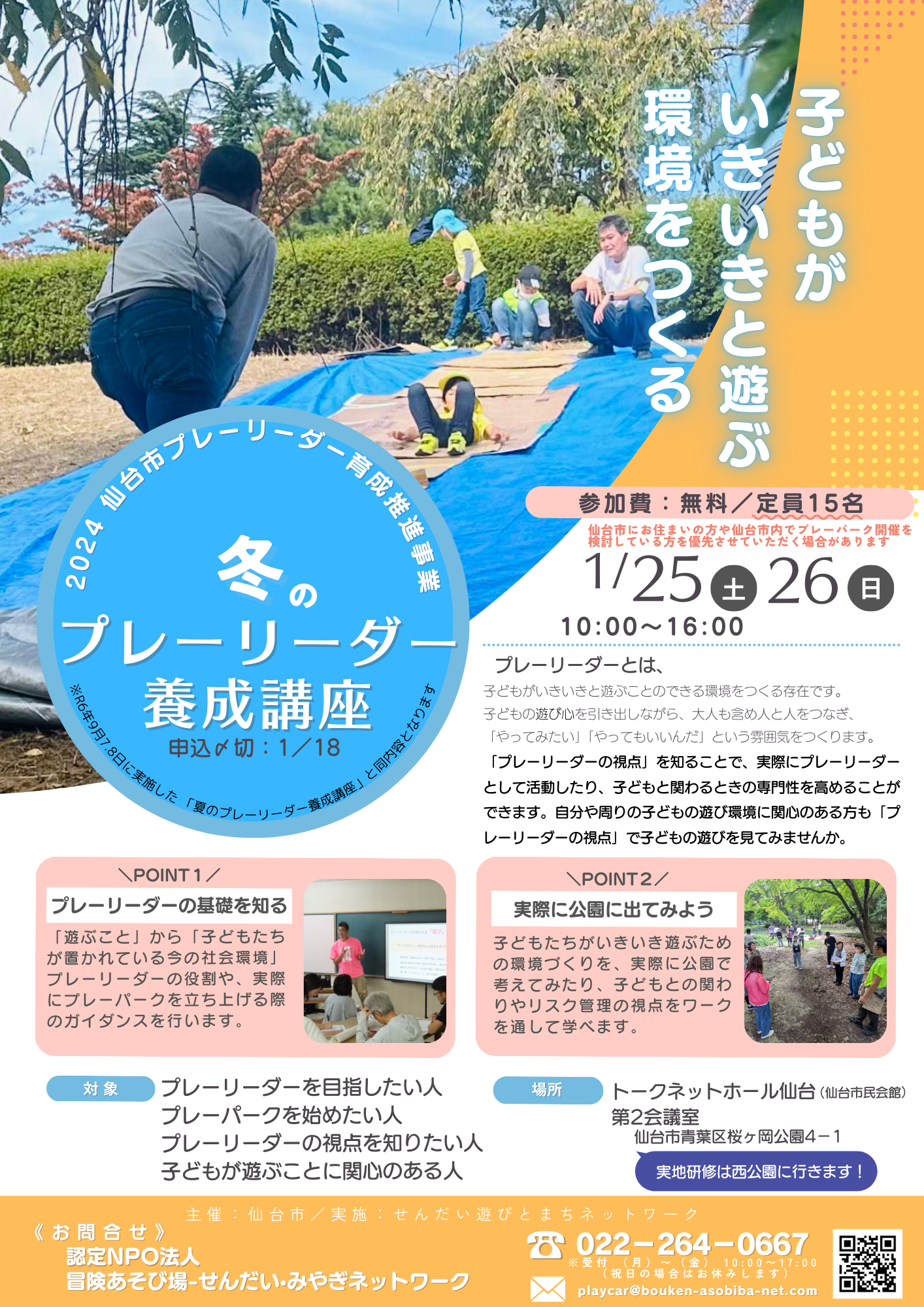 1/25(土)・26(日)の2日間、子どもがいきいきと遊べる環境をつくる「プレーリーダー」について、講義・グループワーク・実地研修を織り交ぜながら楽しく学べる講座を、トークネットホール仙台(仙台市民会館)にて開催します。