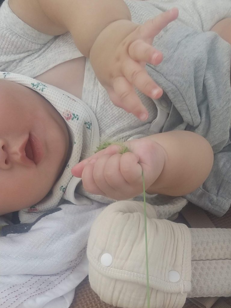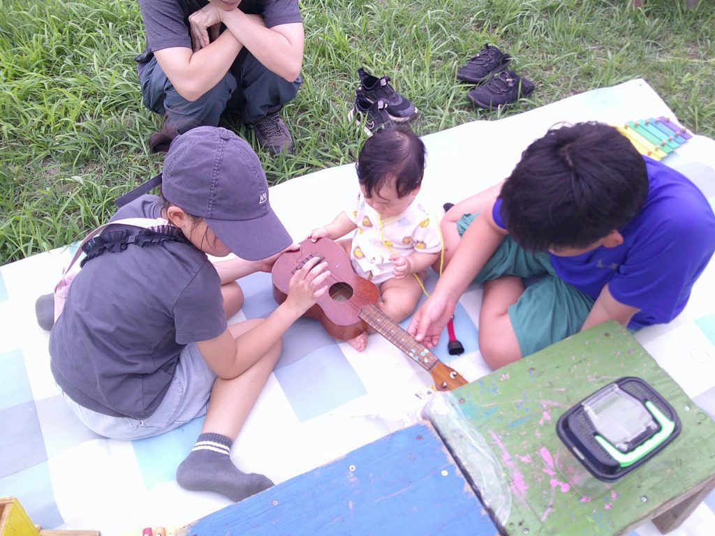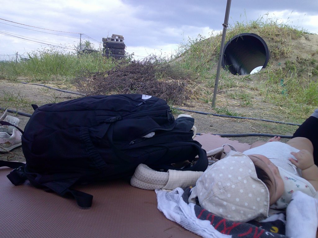 まだ歩けなくても、地面に敷いたブルーシートやジョイントマットの上に寝ころんで、車の音や鳥の声など、聞こえてくる様々な音に反応したり、風に揺れる葉っぱを目で追ったり。