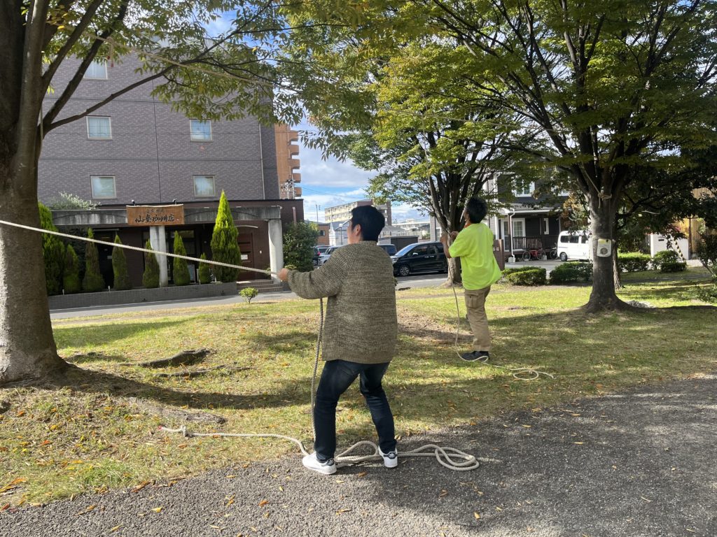 高いところで枝分かれしている又の部分にロープを投げてひっかけます。これがなかなか難しい。