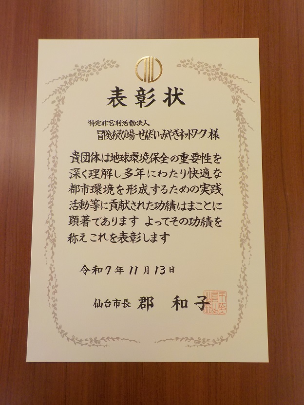 表彰されました! 2025/12/16 報告 この度、当団体は、仙台市より「快適な都市環境を形成するための実践活動等」について表彰されました。ありがとうございました。これからも精進してまいります。 発見力(遊びの一コマ)【報告】「子どもの遊び環境デザイン講座2025」に、アドバイザー参加してきました!