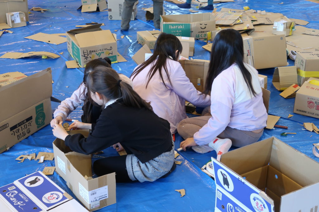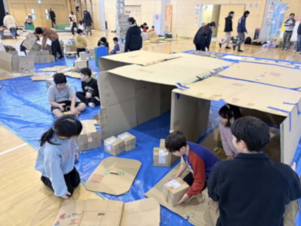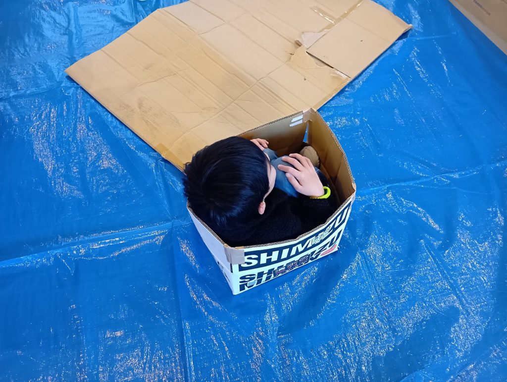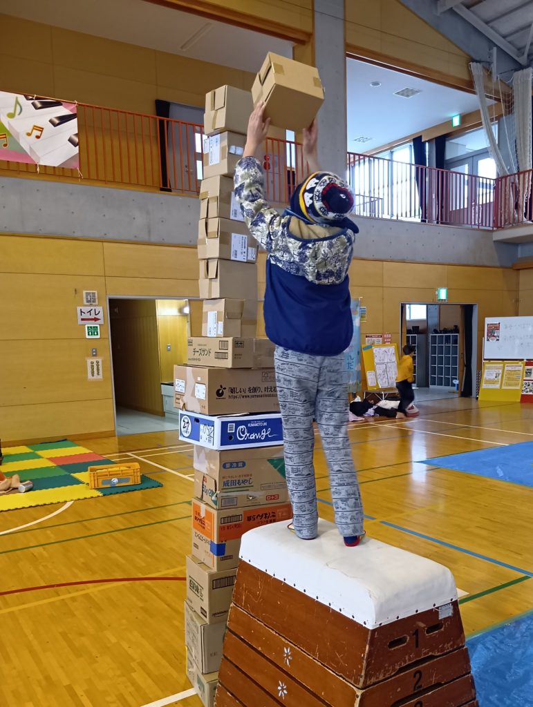 近隣のスーパーマーケットさんからたくさんいただいた段ボールでは、自由に工作したり、高く積み上げたりして遊びました。