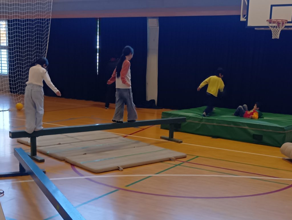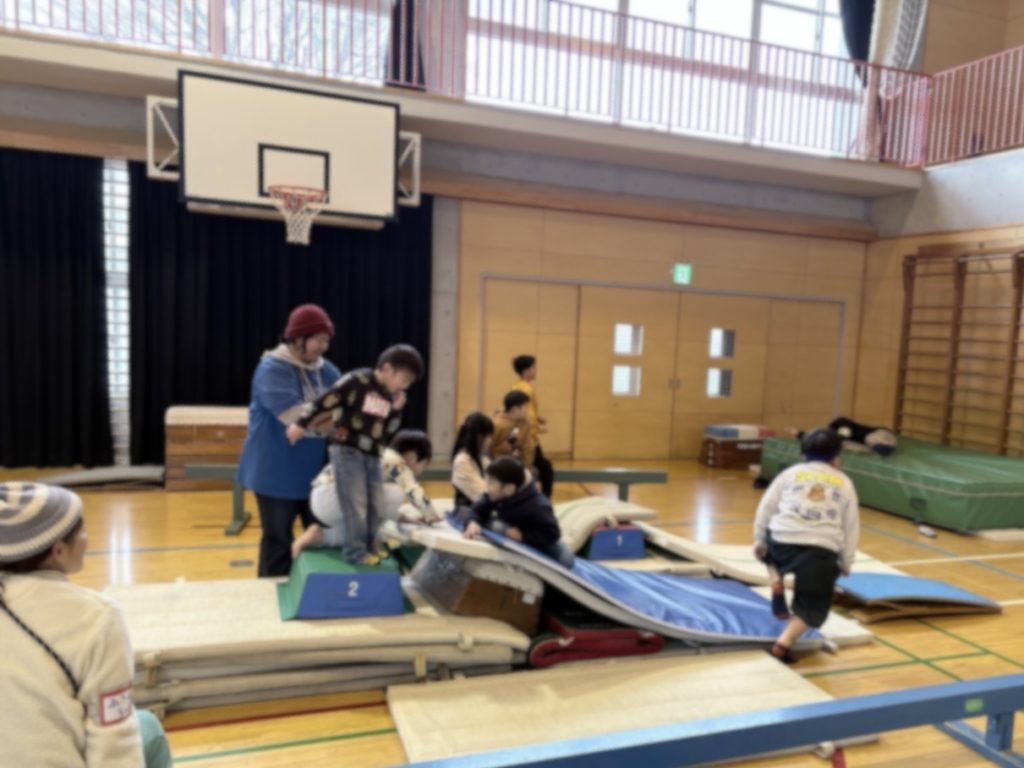 分厚いマットに向かって飛び降りる遊びや、平均台で作ったコースを渡る遊びをしました。コースもこどもたちが話し合って作っていました。