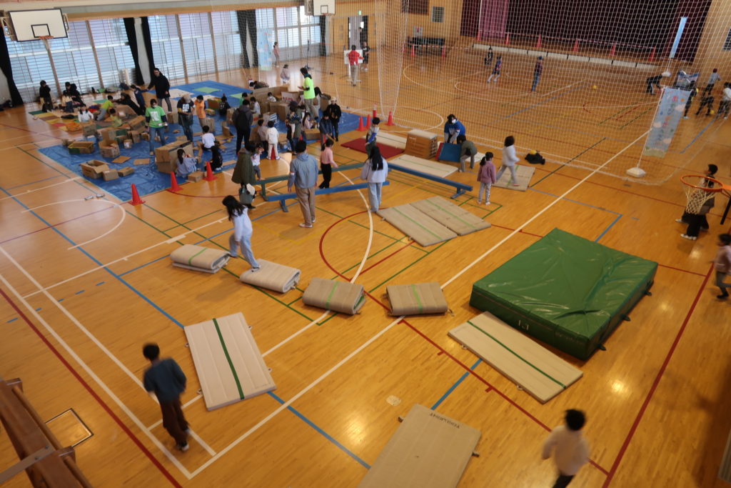 今回は、身近な場所でものびのび遊べるということを知ってもらおうと、体育館にもとからある道具や地域や近隣での入手がしやすいものを大切に開催しました。