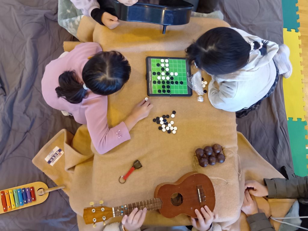 昨年も人気だったニセこたつ(テーブルに布団をかけているだけで熱源の無い見せかけだけのこたつ)で、ボードゲームをしたり、おしゃべりをしたり。大きな紙を広げてお絵かきも。