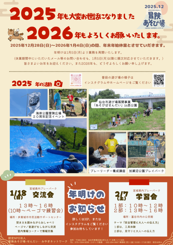 2025年12月28日(日)~2026年1月4日(日)の間、冒険あそび場-せんだい・みやぎネットワークは年末年始休業とさせていだきます。