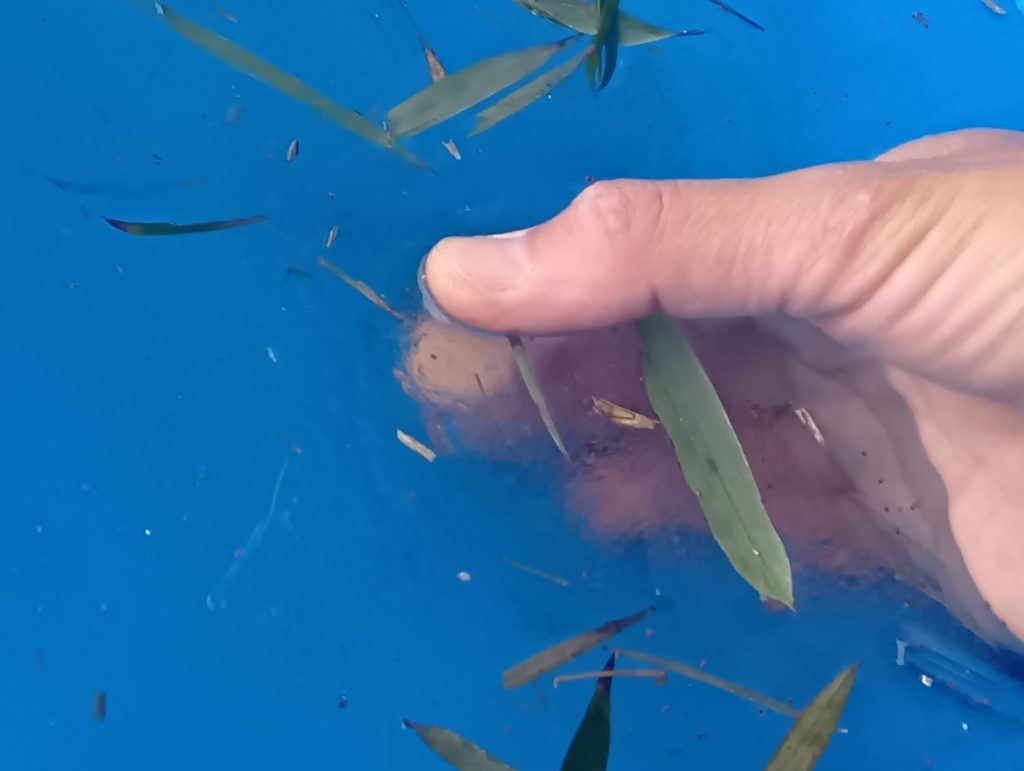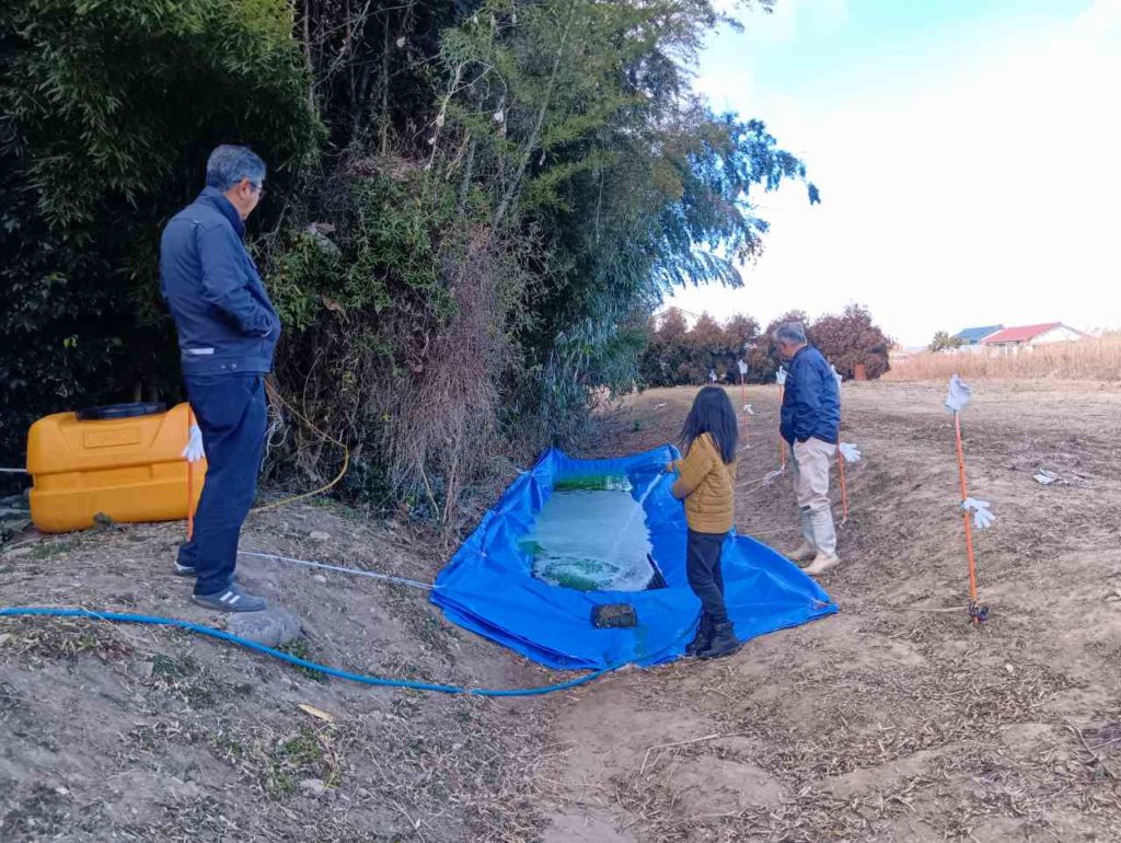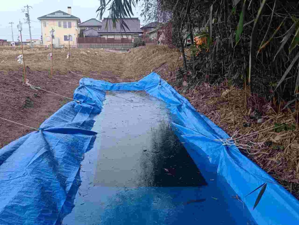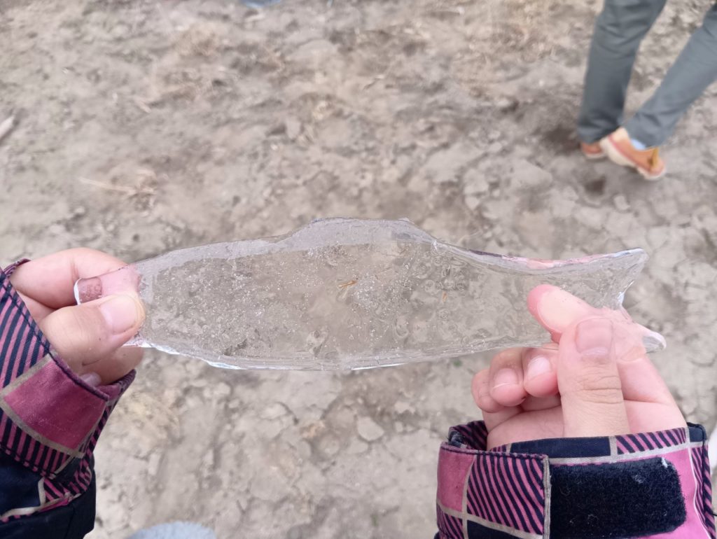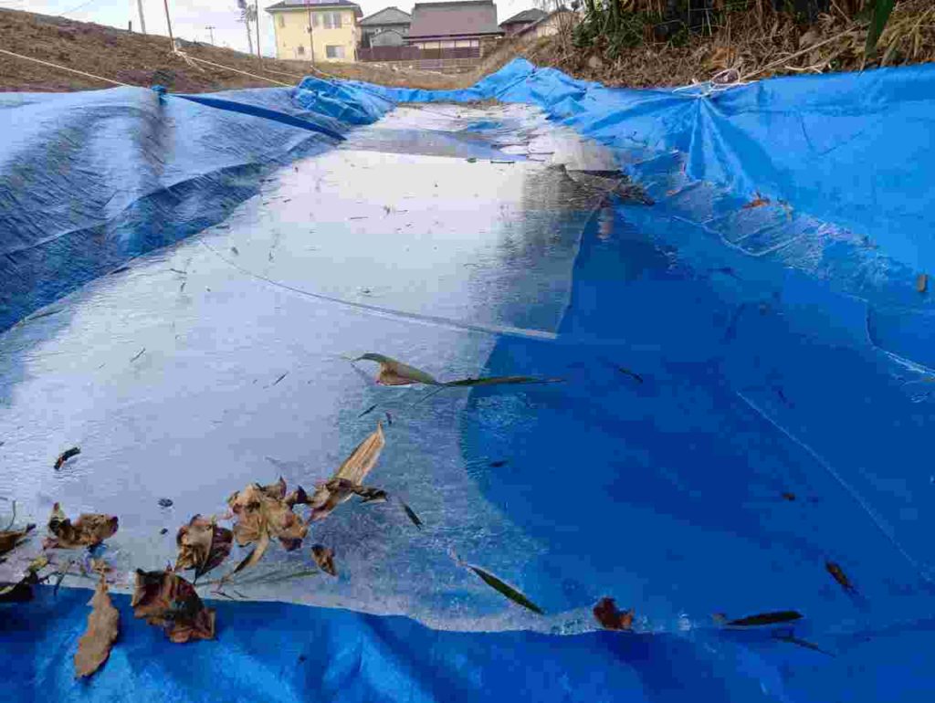 一度成長した氷は、日が当たらなければ簡単には溶けず、かつての水路跡にシート張ってためたところでは、1cm~2cm位の厚さの氷が全面に残っていました!