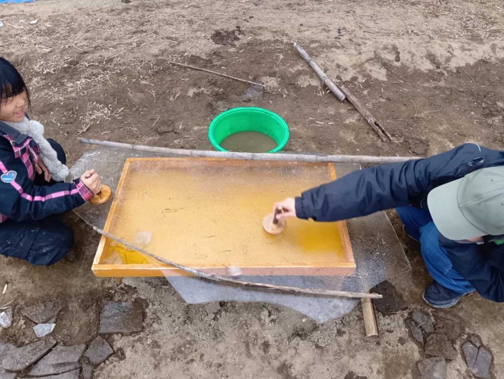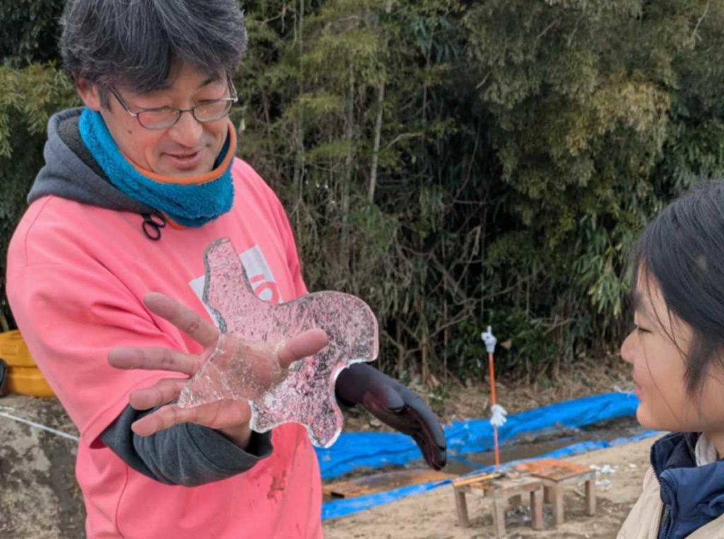 「これ以上とけないように、水抜いておいた方がいいよ」とアドバイスいただき、水を抜くと、バリッバリッと大きな塊に。それを取り出す子たち。