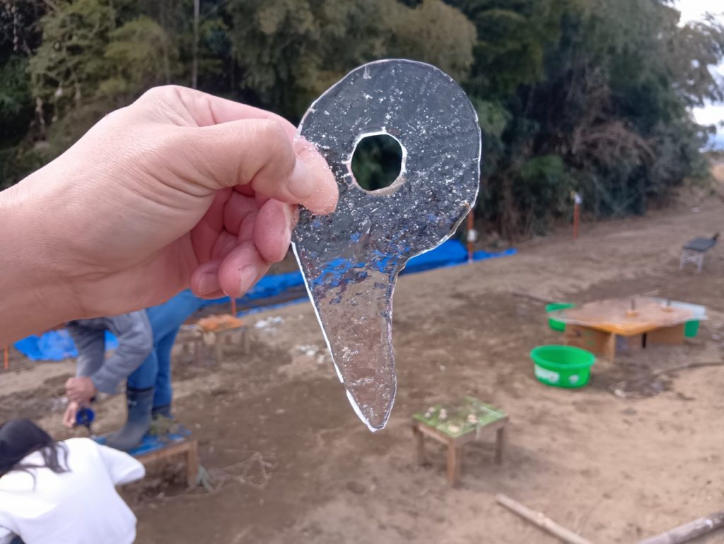 氷を大きいまま取り出すところから始まり、踏んで割る、削る、切る、たき火でとかす、穴をあける、投げ飛ばす、地面に投げつけ叩き割る、台に乗せその上をツルツル、氷片を氷にすべらす、氷の台でホッケー、…氷があるというだけで、いろいろと遊びがひろがりました。