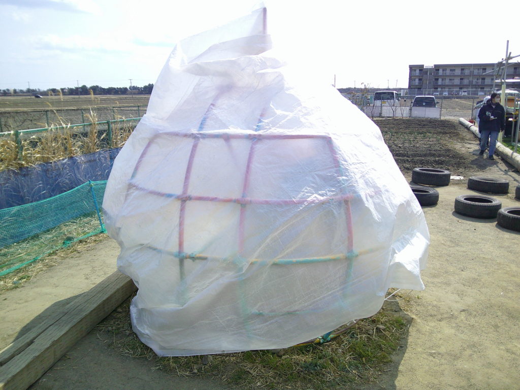 風を避けるため、プレーカーにあるものと、キッズファームに設置されていた遊具でこんなものを作ってみました。